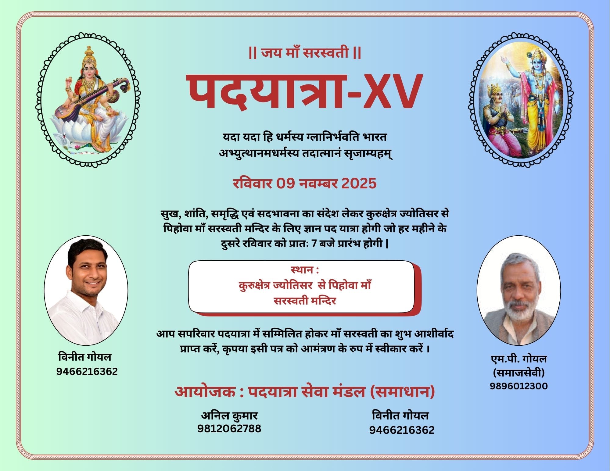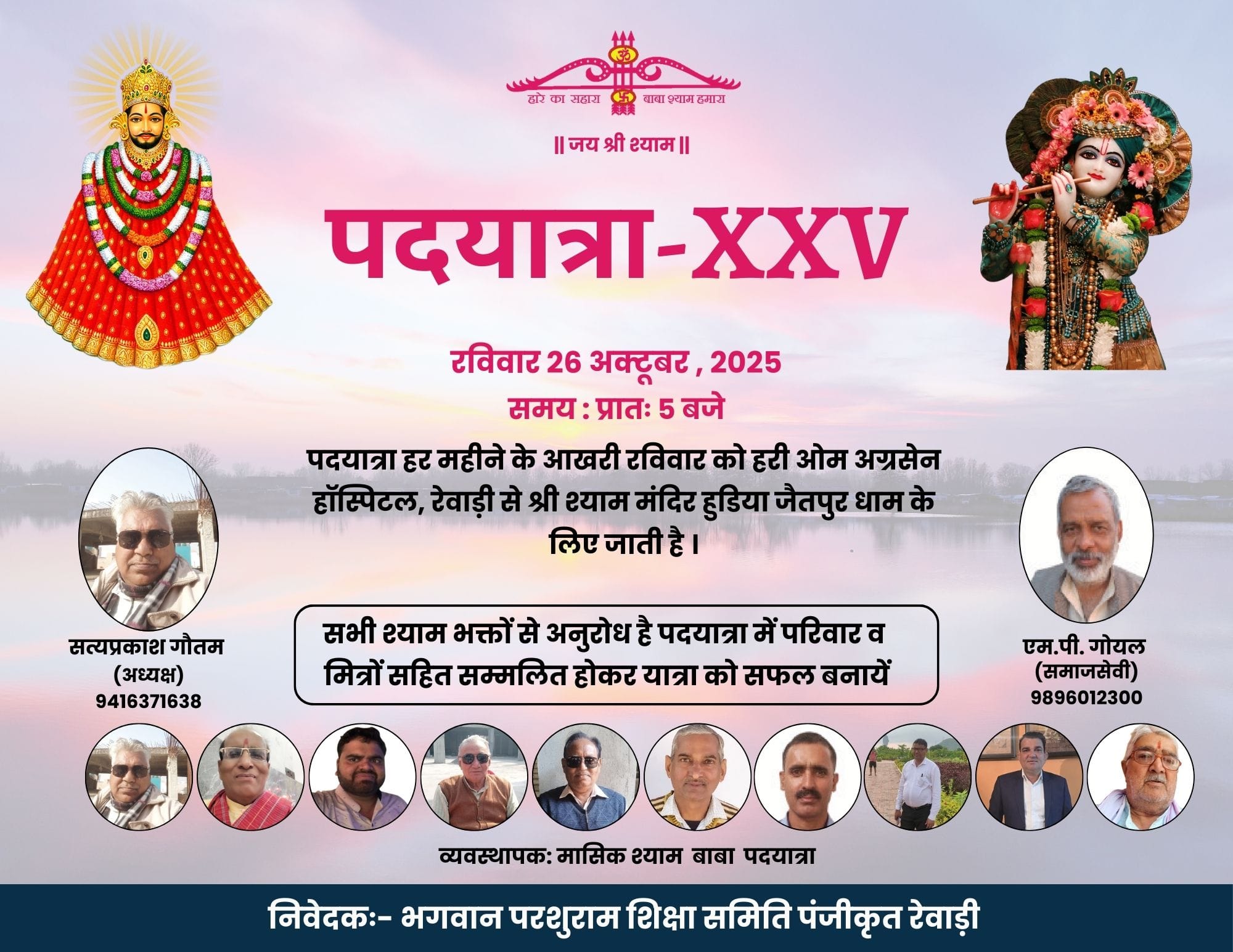 Shyam Baba Padyatra Hariom Aggersan Hospital Kanod Gate, Circular Road, Rewari, Haryana, IndiaOctober 07,2025 09:00am,Budhpur (Rewari) 7 अक्टूबर 2025 को भगवान परशुराम शिक्षा समिति परिसर बूढ़पुर रेवाड़ी और हिमालय परिवार हरियाणा प्रांत के संयुक्त तत्वाधान में शरद पूर्णिमा पर प्रधान सत्य प्रकाश गौतम भगवान परशुराम शिक्षा समिति एवं प्रदेश महामंत्री और प्रांत अध्यक्ष श्री लक्ष्मी नारायण शर्मा हिमालय परिवार की अध्यक्षता में महर्षि वाल्मीकि और मीराबाई के […]