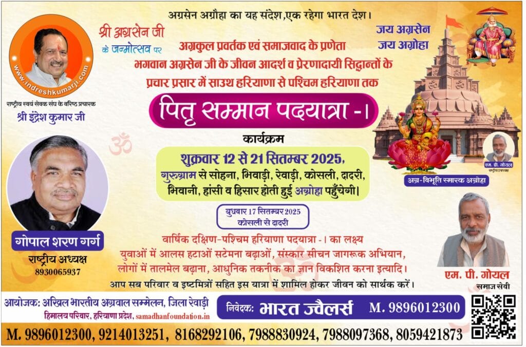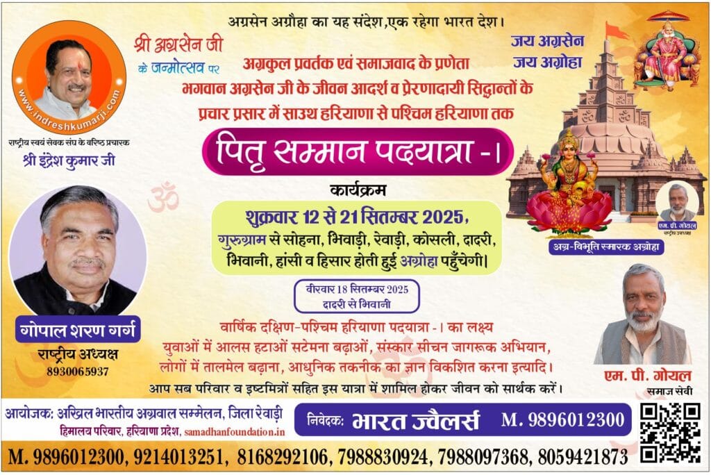 12 सितम्बर 2025 को ओल्ड राव होटल धारूहेड़ा में नौ दिवसीय पितृ सम्मान पदयात्रा का शुभारम्भ करते हुए M.P.Goyal.