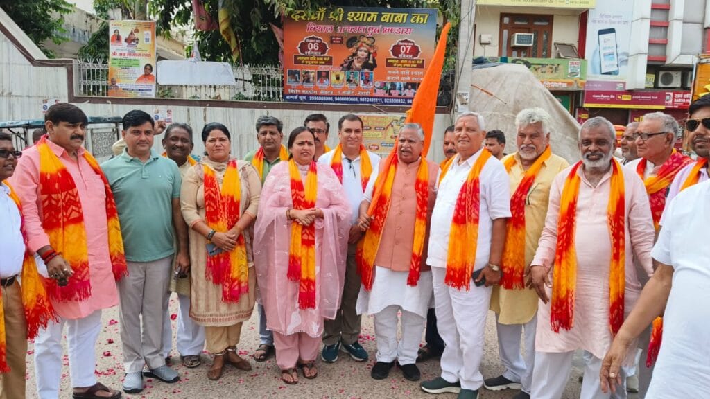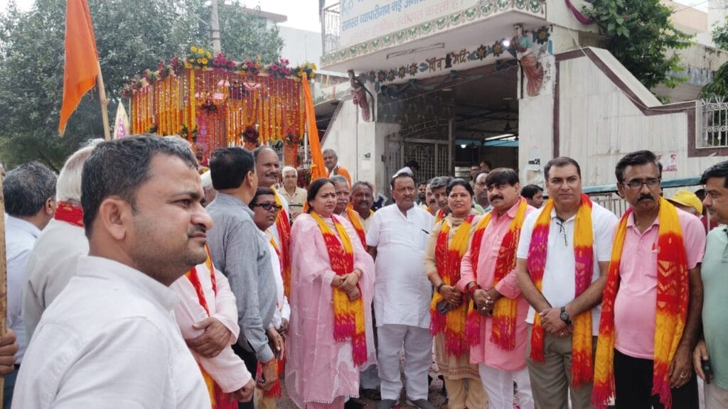 Smt. Vandana Popli, District President BJP Rewari, and Shri Gopal Sharan Garg, National President of Akhil Bhartiya Agarwal Sammelan, participated in the Kalash Yatra from Shiv Mandir, Anaj Mandi, Rewari, for the three-day Agra Bhagwat Katha at Haroim Aggresan Hospital.